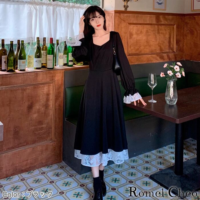 【お支払い確認後20日以内発送】RomelCheo バック レースアップ ワンピース 編み上げ リボン 裾レース フレアスリーブ aライン レディース 黒 赤 ミモレ ロング きれいめ フェミニン ガーリー 大人可愛い レトロ ファッション ロメルチェオ