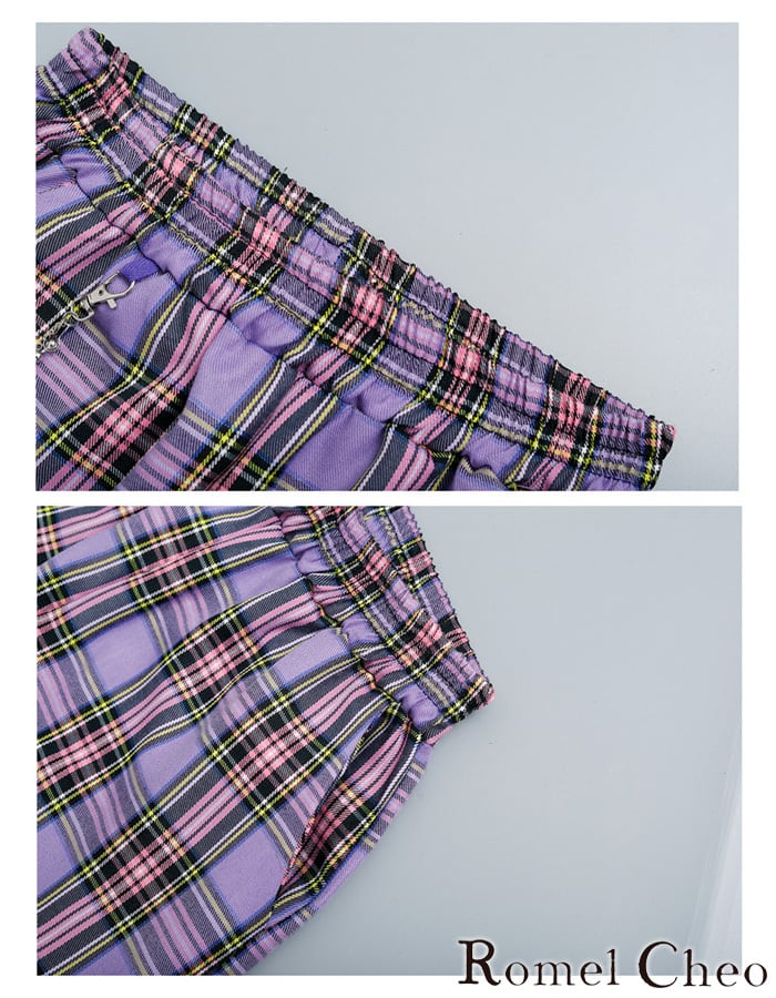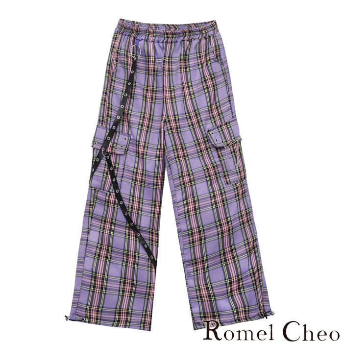 【お支払い確認後20日以内発送】RomelCheo パープルチェックワイドカーゴ カーゴパンツ バギーパンツ ワイドパンツ ボリューム チェック柄 レディース モード系 ストリート ファッション パンク ロック ロリータ 個性的 夢かわ 病みかわ 青文字系 森ガール 原宿系 カジュアル ロメルチェオ