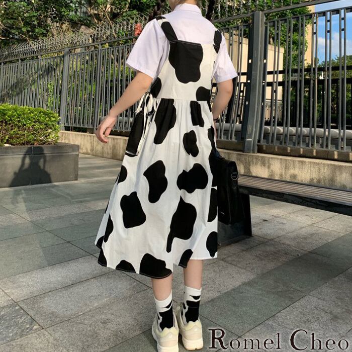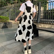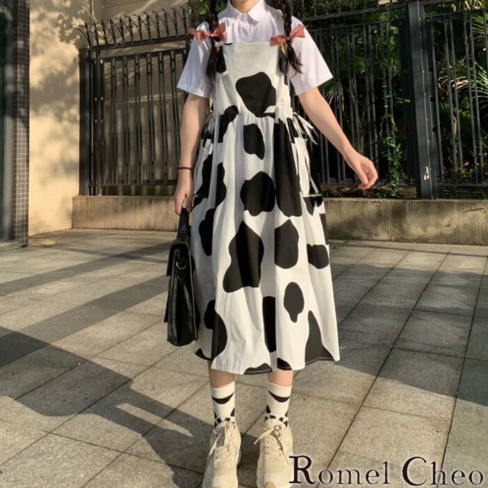 【RomelCheo】 牛柄ジャンパースカート ジャンスカ ひざ丈 Aライン 総柄 COW柄 ワンピース ハイウェスト レディース モード系 ストリート ファッション ロリータ ガーリー 個性的 夢かわ 病みかわ 青文字系 森ガール 原宿系 カジュアル ロメルチェオ