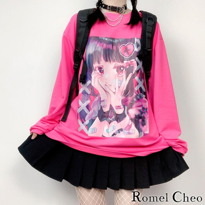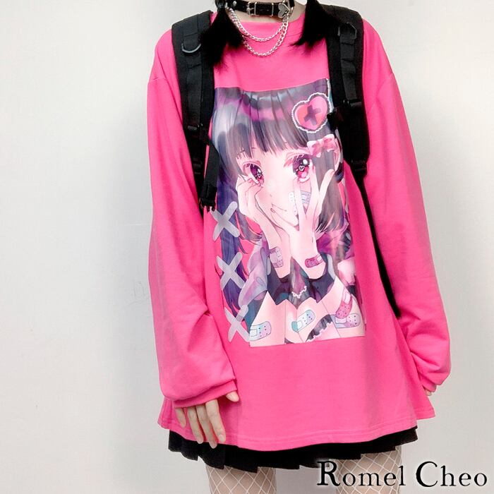 【お支払い確認後20日以内発送】RomelCheo イラスト ローズ ピンク 長袖 tシャツ ロンt ロング プリント ゆめかわいい 病みかわいい レディース ストリート系 原宿系 青文字系 ガーリー ロリータ 大人可愛い カジュアル ファッション ロメルチェオ