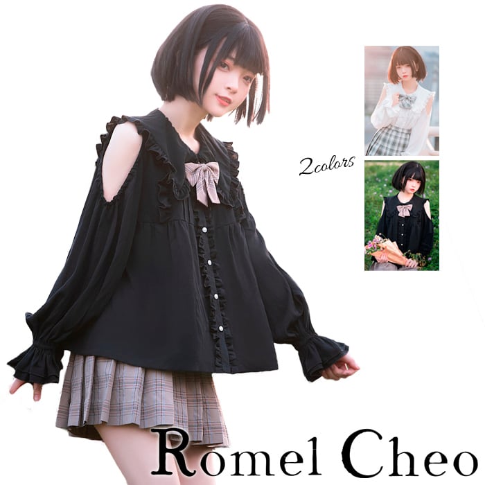RomelCheo オフショル ボリューム スリーブ ブラウス オープンショルダー 肩あき 肩出し オフショル レディース 白 黒 長袖 シャツ フリル 薄手 かわいい 大人可愛い 原宿系 青文字系 ロリータ ゴスロリ 甘ロリ ガーリー 森ガール ファッション ロメルチェオ