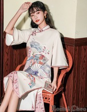 【お支払い確認後20日以内発送】RomelCheo 和柄チャイナワンピース チャイナワンピ チャイナドレス チャイナ服 チャイナボタン 半袖 Aライン ひざ丈 ボリューム袖 エスニック スリット 個性的 漢服 レディース モード系 ファッション 原宿系 青文字系 カジュアル ファッション ロメルチェオ