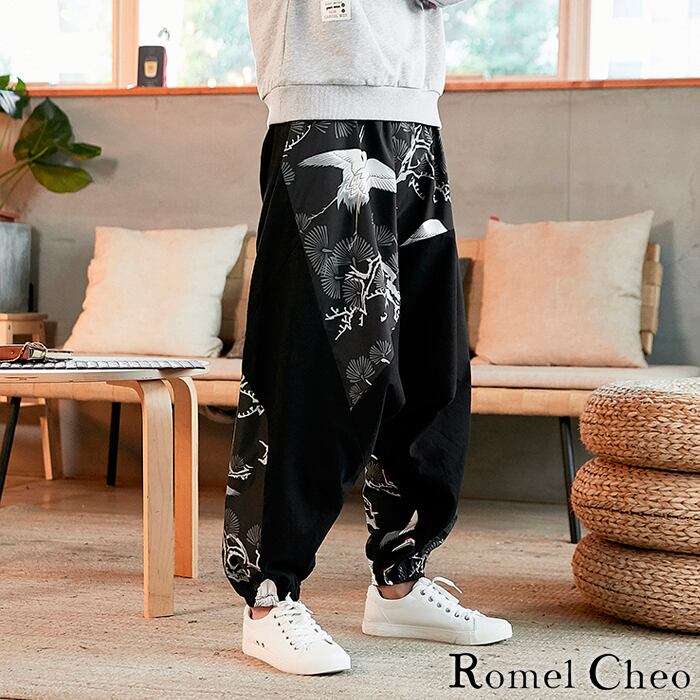 【お支払い確認後20日以内発送】RomelCheo 鶴柄 ビッグ サルエル パンツ ワイド パンツ 和柄 和風 ルーズ ビッグシルエット メンズ レディース ジョガー ハーレム 裾絞り 切替 ウエストゴム アジアン エスニック ストリート系 原宿系 hiphop ダンス カジュアル ファッション ロメルチェオ