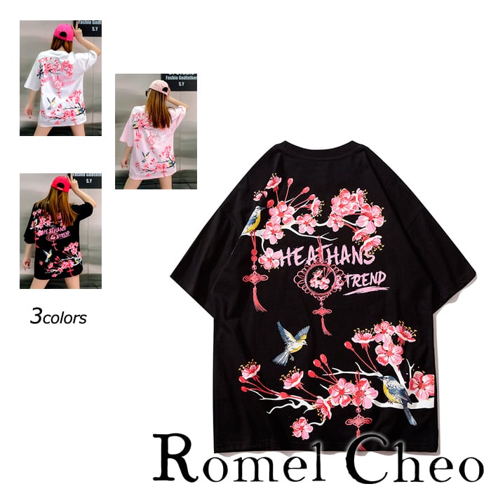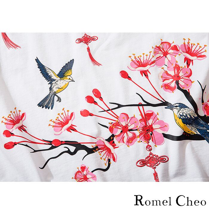 【お支払い確認後20日以内発送】RomelCheo 梅 鳥 和風 tシャツ 半袖 和柄 レディース プリント 花柄 花鳥 白 ピンク 黒 綿 ビッグシルエット ストリート カジュアル 原宿系 アジアン エスニック hiphop ファッション ロメルチェオ ロメルチェオ