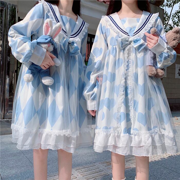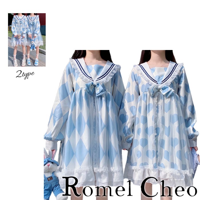 【お支払い確認後20日以内発送】RomelCheo ブルー ホワイト セーラー ワンピース ダイヤ ハート ロリータ リボン フリル シフォン 長袖 膝丈 aライン ウエストリボン 裾フリル レディース マリン スタイル ガーリー ゆめかわ 大人可愛い 原宿系 アリス系 ファッション ロメルチェオ