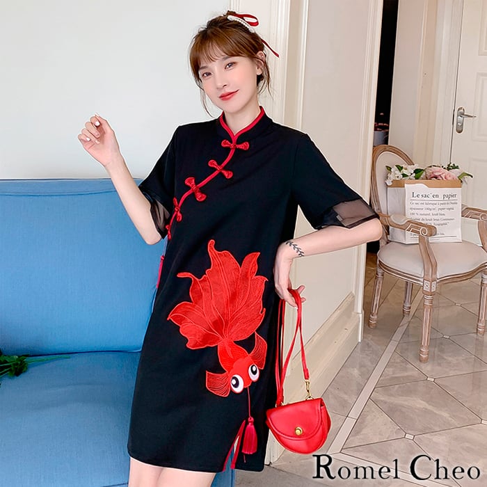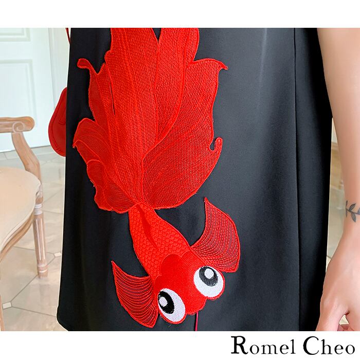 【お支払い確認後20日以内発送】RomelCheo 金魚柄 チャイナ ミニ ワンピース レディース 半袖 刺繍 赤黒 aライン チャイナボタン ストリート系 原宿系 青文字系 カジュアル ファッション エスニック アジアン ガーリー 病みかわ 大人可愛い 漢服 普段着 ロメルチェオ