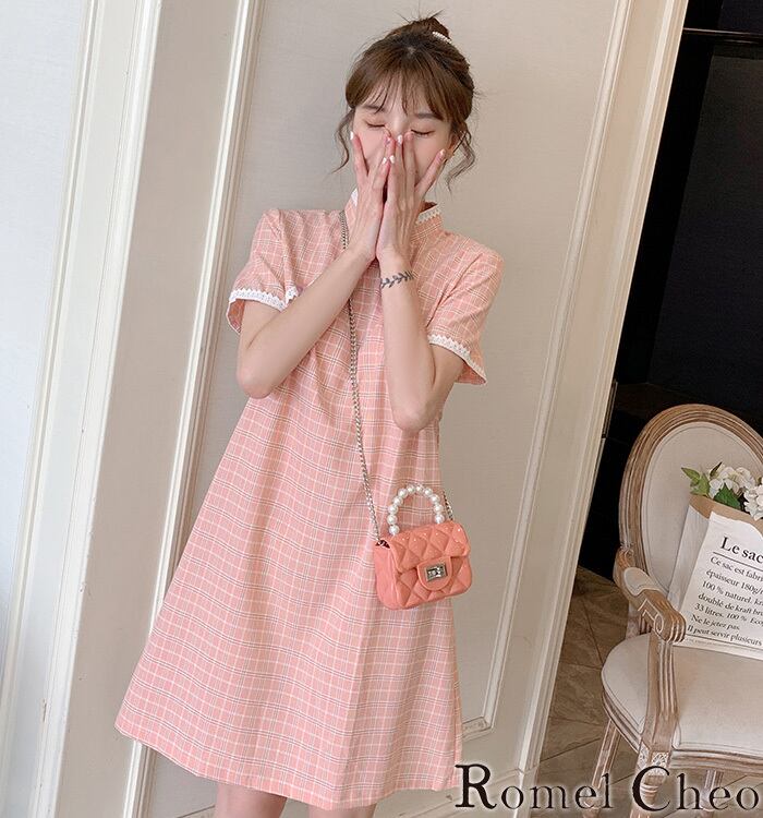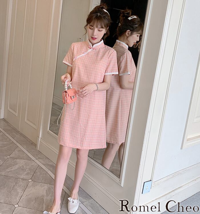 【お支払い確認後20日以内発送】RomelCheo ピコレースチェックチャイナミニワンピ チャイナワンピ チャイナドレス チャイナボタン ミニワンピース レース Aライン ゆったり 膝上丈 ミニ丈 エスニック 個性的 原宿系 ガーリー ロリータ 青文字系 レディース モード系 ファッション ロメルチェオ
