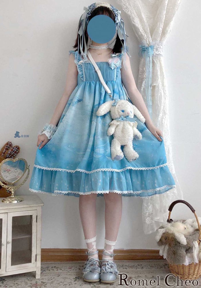 【お支払い確認後20日以内発送】RomelCheo オーシャンクラゲシフォンワンピース リボン レース ノースリーブ ワンピ ひざ丈 Aライン 個性的 原宿系 ガーリー ロリータ 甘ロリ 病みかわ メルヘン パンク 青文字系 レディース モード系 ファッション ロメルチェオ