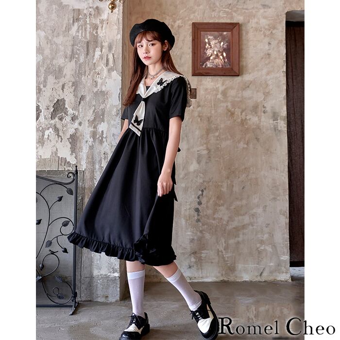 【お支払い確認後20日以内発送】RomelCheo モノクロ セーラー バタフライ ワンピース レディース 膝丈 蝶 モチーフ 半袖 夏ワンピース aライン 裾フリル デート服 マリンルック モノトーン 原宿系 病みかわいい ロリータ系 ゴシック モード系 ガーリー 大人可愛い ファッション ロメルチェオ