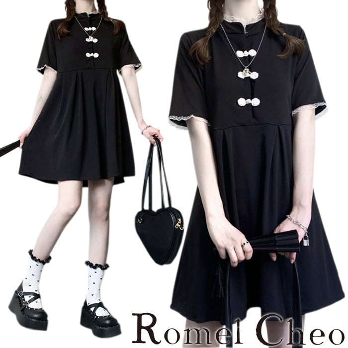 【お支払い確認後20日以内発送】RomelCheo レトロブラックチャイナワンピ チャイナワンピ チャイナドレス チャイナボタン ミニワンピース ミニ丈 Aライン レース 切り替え エスニック 個性的 原宿系 ガーリー ロリータ 青文字系 レディース モード系 ファッション ロメルチェオ