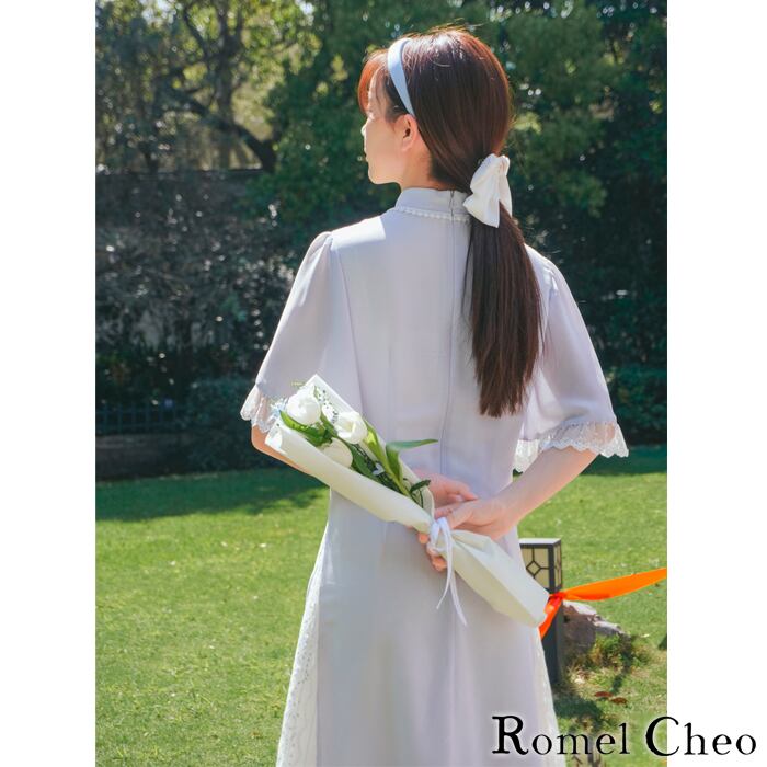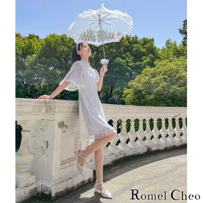 【お支払い確認後20日以内発送】RomelCheo エレガント レース チャイナ ワンピース 膝丈 チャイナボタン シフォン 裾フリル フレアスリーブ 花柄 刺繍 切替 aライン ミニドレス アジアン エスニック おしゃれ 個性的 大人可愛い ガーリー 清楚 きれいめ ゆめかわいい ファッション ロメルチェオ
