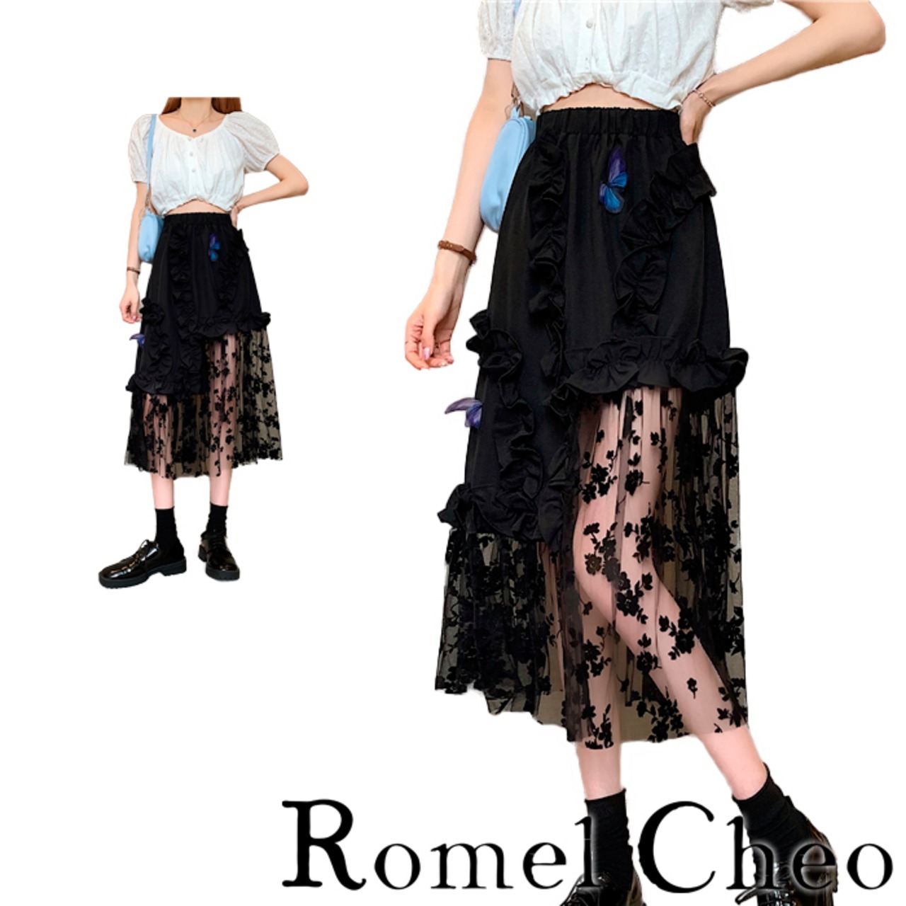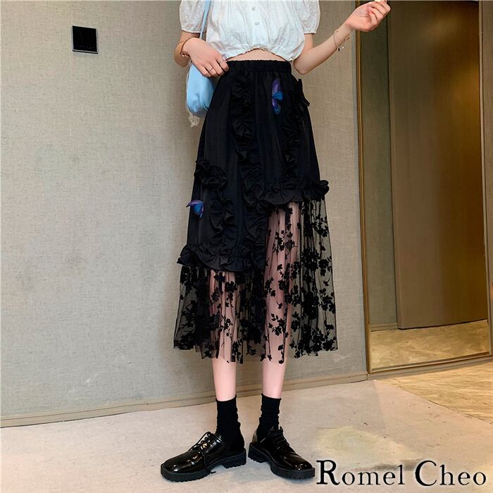 【お支払い確認後20日以内発送】RomelCheo フラワー メッシュ アシメ スカート 黒 アシンメトリー フリル チュール 蝶 ミモレ丈 ロング丈 レディース aライン バタフライ ウエストゴム 原宿系 ロック ゴスロリ モード系 ガーリー 大人可愛い 個性的 カジュアル ファッションロメルチェオ