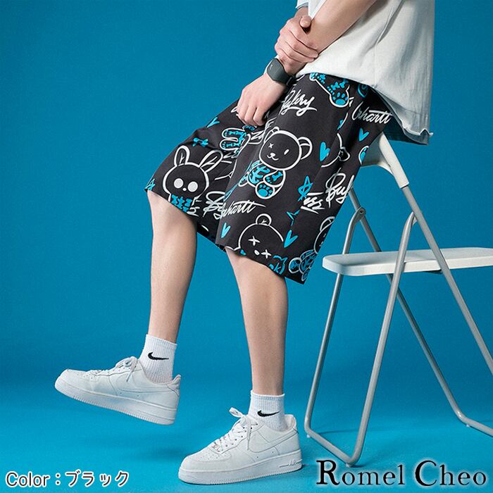 【お支払い確認後20日以内発送】RomelCheo ベア ラビット 五分丈 パンツ ハーフ サーフ ビーチ クマ ウサギ 落書き風 プリント 短パン 薄手 ワイドレッグ メンズ モノトーン ゆったり カジュアル ストリート ファッション 原宿系 スポーティー スポーツmix hiphop 夏 海 ロメルチェオ