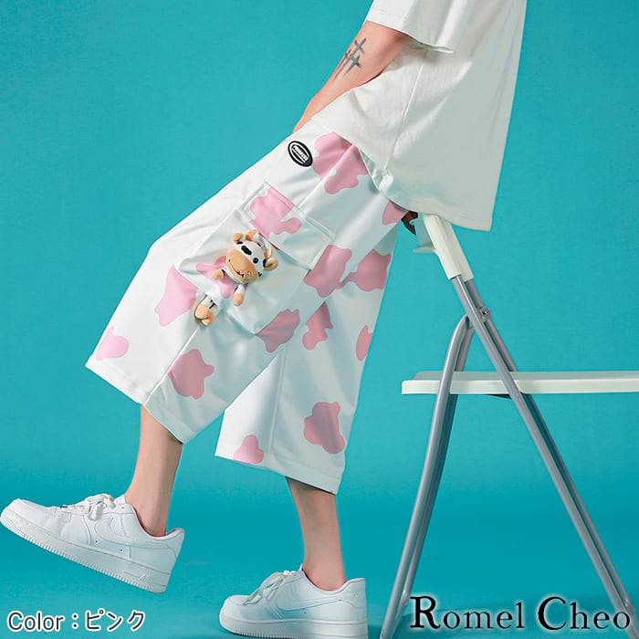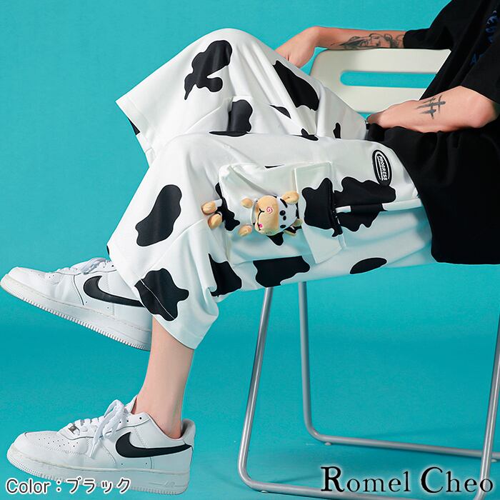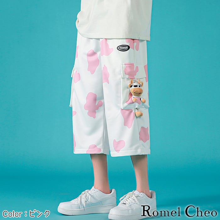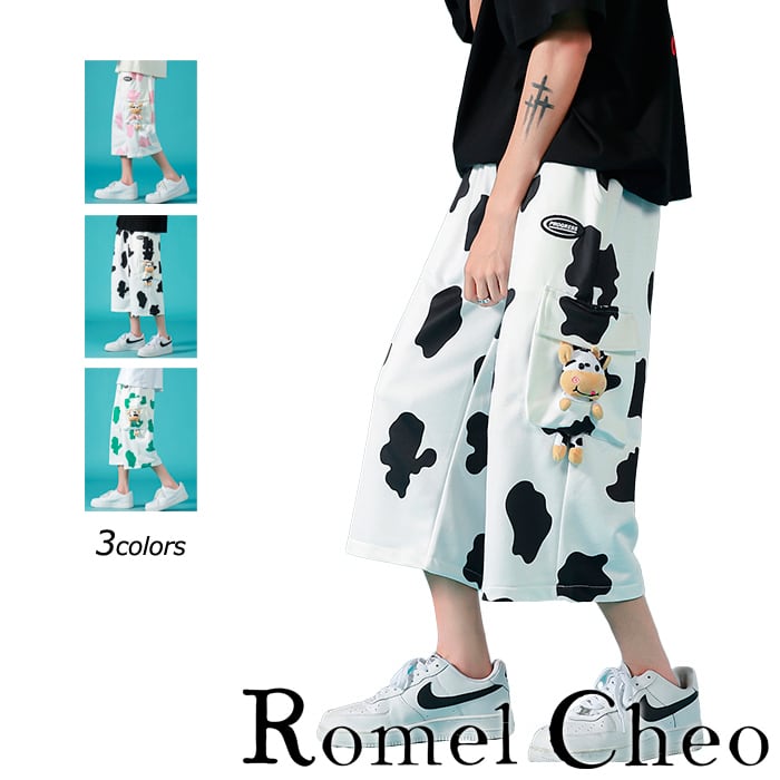 【お支払い確認後20日以内発送】RomelCheo 牛柄 マスコット 七分丈 パンツ アニマル イージー カーゴ クロップド メンズ レディース ユニセックス ワイドレッグ ウエストゴム ゆったり カジュアル ストリート ファッション 原宿系 ダンス hiphop スケーター ワンマイルウェア ロメルチェオ