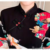 【お支払い確認後20日以内発送】RomelCheo レトロ プリント チャイナ ワンピース チャイナボタン 膝丈 レディース 七分袖 扇 鶴 和柄 黒 フレア袖 スリット ストリート系 原宿系 青文字系 カジュアル ファッション エスニック アジアンテイスト クラシック エレガント 大人可愛い ロメルチェオ