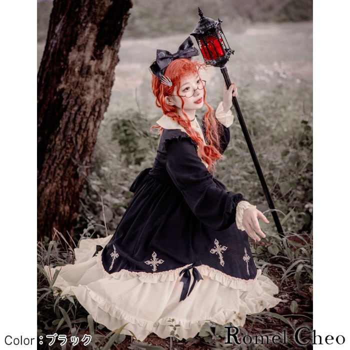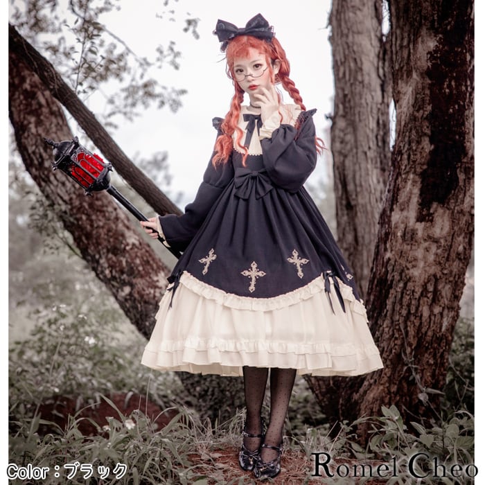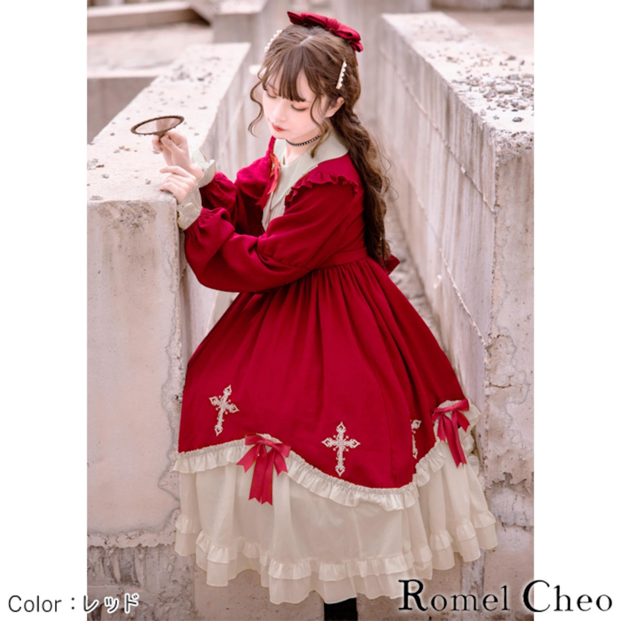 【お支払い確認後20日以内発送】RomelCheo ゴスロリ ビッグスイング ワンピース ゴシック ロリータ ドレス プリンセスライン ロング 裾フリル ボリューム袖 リボン 十字架 クロス 刺繍 黒ロリ 赤ロリ 長袖 原宿系 青文字系 エレガント レトロ クラシック ガーリー ファッション ロメルチェオ
