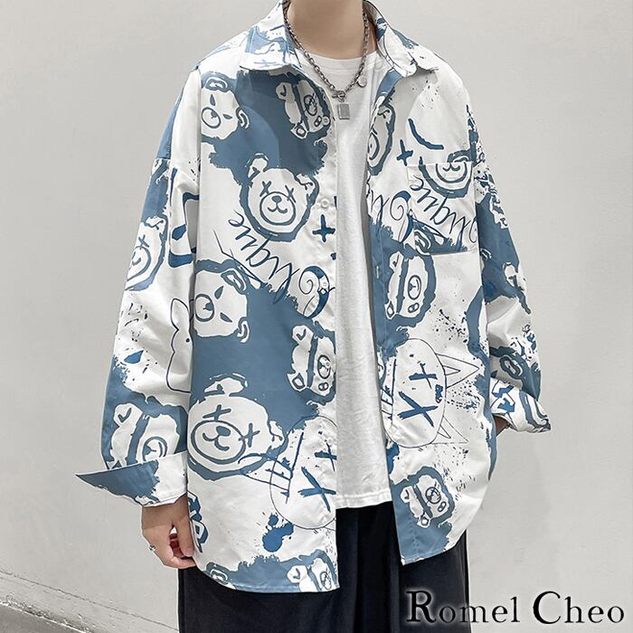 【お支払い確認後20日以内発送】RomelCheo 原宿系 落書き風 クマ柄 シャツ プリント くま 熊 ベアー 長袖 総柄 カジュアル デザイン メンズ レディース ユニセックス イラスト ペイント 個性派 pop ストリート ビッグシルエット レトロ ファッション ロメルチェオ