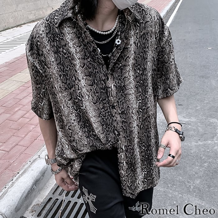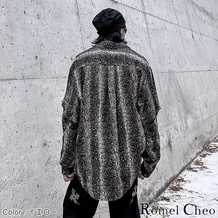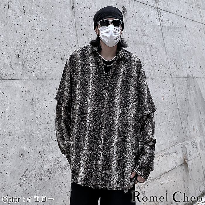 【お支払い確認後20日以内発送】RomelCheo 2way袖 アニマル パイソン シャツ ヘビ柄 蛇柄 スネイク 総柄 プリント メンズ レディース ユニセックス シフォン 薄手 半袖 長袖 袖スリット アームカバー 原宿系 ストリート系 個性的 きれいめ カジュアル ファッション ロメルチェオ
