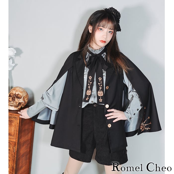 【お支払い確認後20日以内発送】 狐仙 刺繍 レトロ風 マント ジャケット ケープ 袖スリット ケープ アウター 長袖 レディース 妖怪柄 キツネ 稲荷神 和柄 黒 エレガント きれいめ 病みかわいい 大人可愛い 原宿系 ガーリー レトロ 大正ロマン コスプレ ファッション ロメルチェオ
