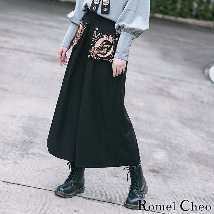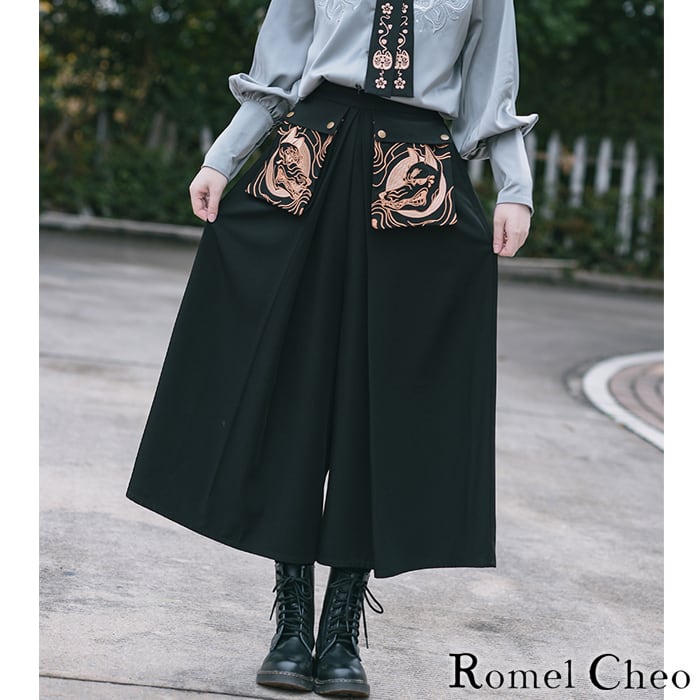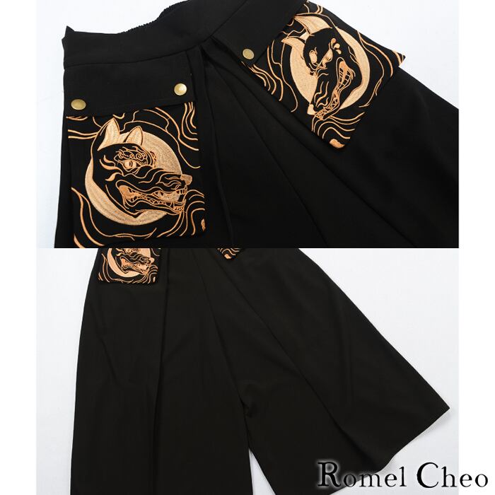 【RomelCheo】狐仙 刺繍 ガウチョ パンツ ワイド 袴 九分丈 レディース aライン 妖怪柄 キツネ 稲荷神 犬神 狛犬 和柄 黒 エレガント きれいめ 病みかわいい 大人可愛い モード系 原宿系 ガーリー ロリータ レトロ 大正ロマン ファッション ロメルチェオ