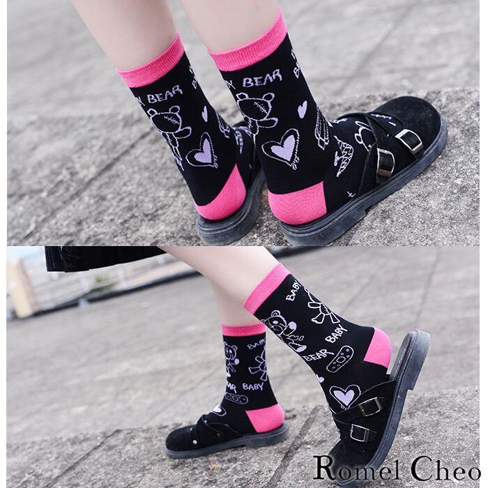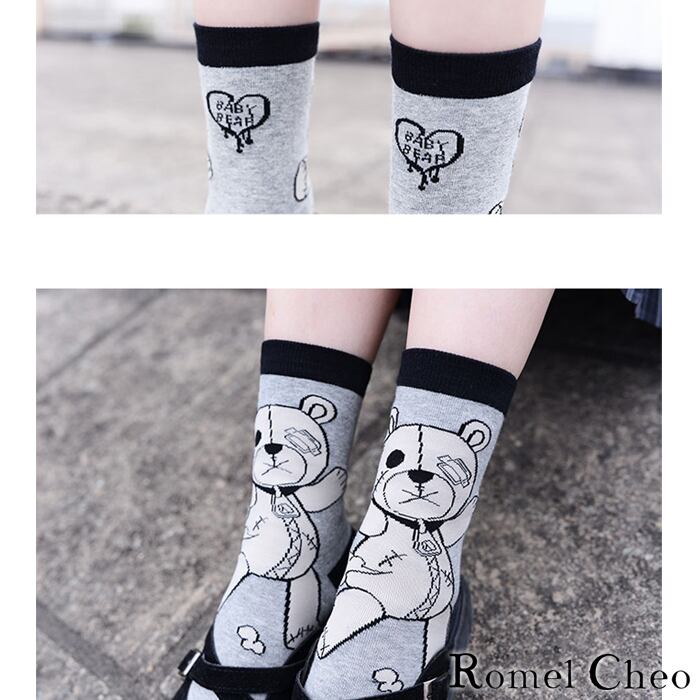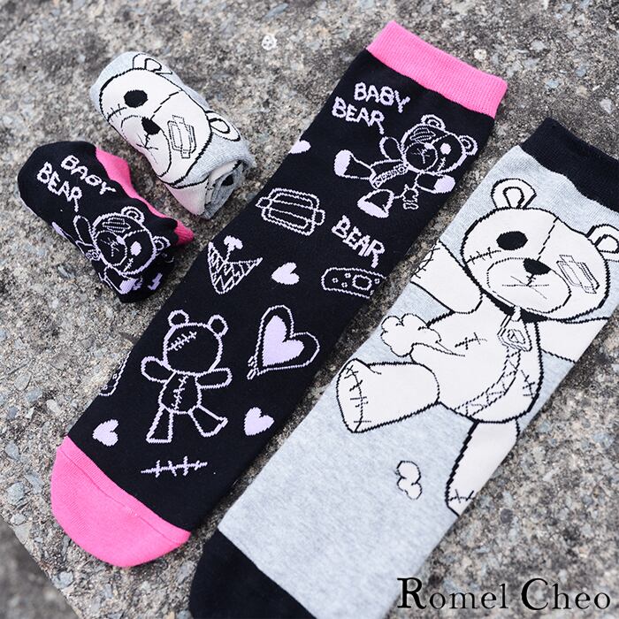 【お支払い確認後20日以内発送】RomelCheo 2足組 病みかわ 負傷 ベア ソックス 靴下 セット 色違い クマ柄 怪我 病みかわいい 綿 コットン クルー ぬいぐるみ テディベア 黒 グレー ピンク 原宿系 青文字系 ガーリー カジュアル ロメルチェオ