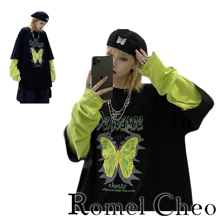 【お支払い確認後20日以内発送】RomelCheo 重ね着風 ネオン パタフライ 長袖 tシャツ メンズ レディース レイヤード風 蛍光 黄緑 蝶柄 ロング ロンt プリント ロゴ ビッグシルエット ダボ 大きいサイズ ゆったり 薄手 韓国 ストリート系 ヒップホップ スケーター ファッション ロメルチェオ