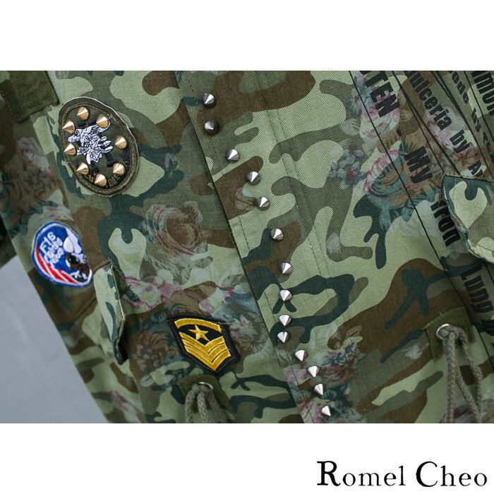 【お支払い確認後20日以内発送】RomelCheo スタッズ ワッペン ミリタリー コート モッズ 鋲 ワッペン 迷彩柄 黒 カモフラージュ プリント レディース アーミー フィールド ジャケット ロング 長袖 アメカジ 秋冬 アウター ストリート系 かっこいい パンク カジュアル ファッション ロメルチェオ