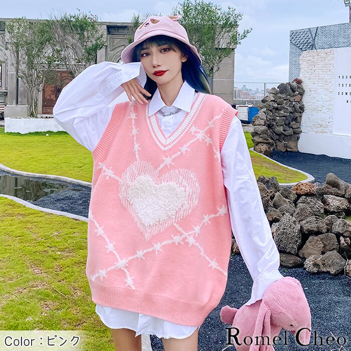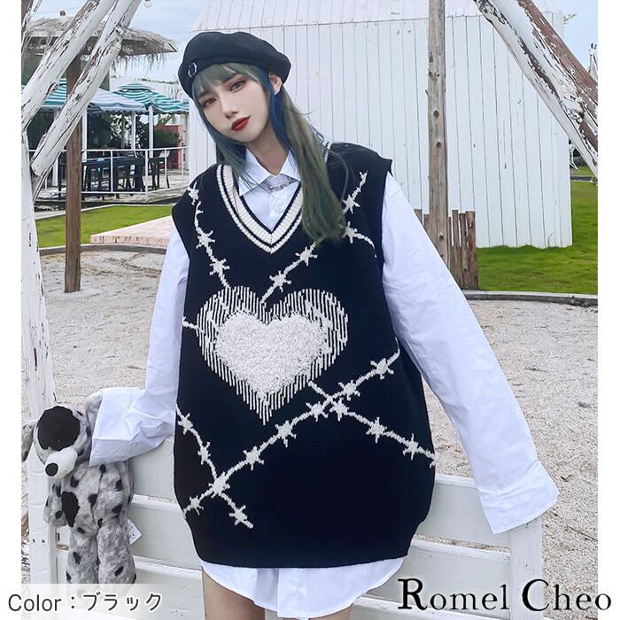 【お支払い確認後20日以内発送】RomelCheo ラブ バーブド ニット ベスト チョッキ ハート 有刺鉄線 鉄条網 ワイヤー vネック メンズ レディース ビッグシルエット ゆったり ダボ ざっくり ジャガード ヒップホップ ストリート系 原宿系 病みかわ パンク カジュアル ファッション ロメルチェオ