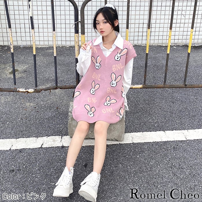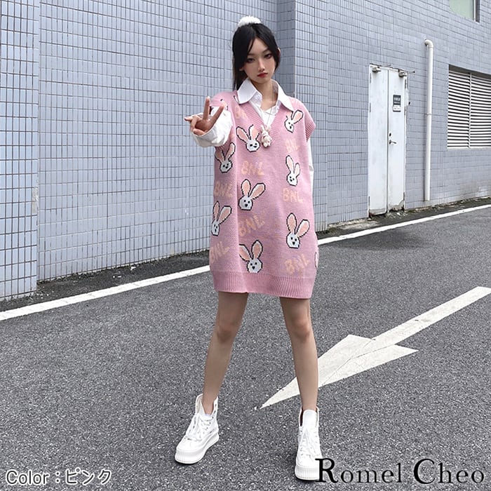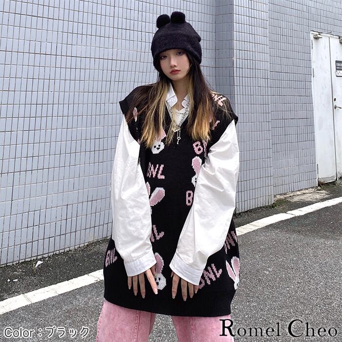 【お支払い確認後20日以内発送】RomelCheo 原宿系 ウサギ柄 ロング ベスト ニット チョッキ 兎柄 総柄 ラビット vネック レディース ビッグシルエット ゆったり ジャガード ヒップホップ ストリート系 原宿系 病みかわ ゆるキャラ カジュアル ファッション ロメルチェオ