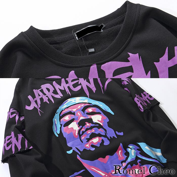 【お支払い確認後20日以内発送】RomelCheo 裏起毛 ヒップホップ トレーナー 長袖 tシャツ ロンt 重ね着風 イラスト ロゴ プリント メンズ レディース ストリート系 原宿系 hiphop ダンス ラッパー dj レゲエ 個性的 個性派 カジュアル アメカジ ファッション ロメルチェオ