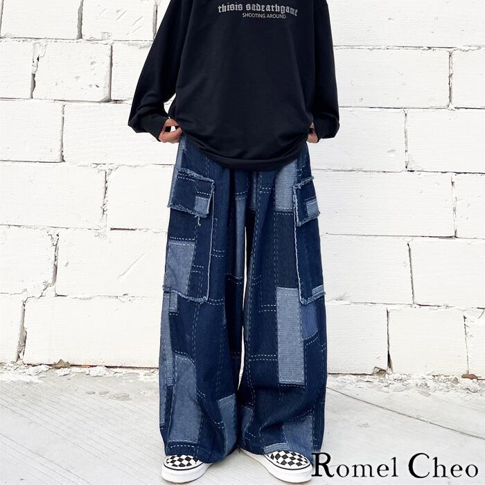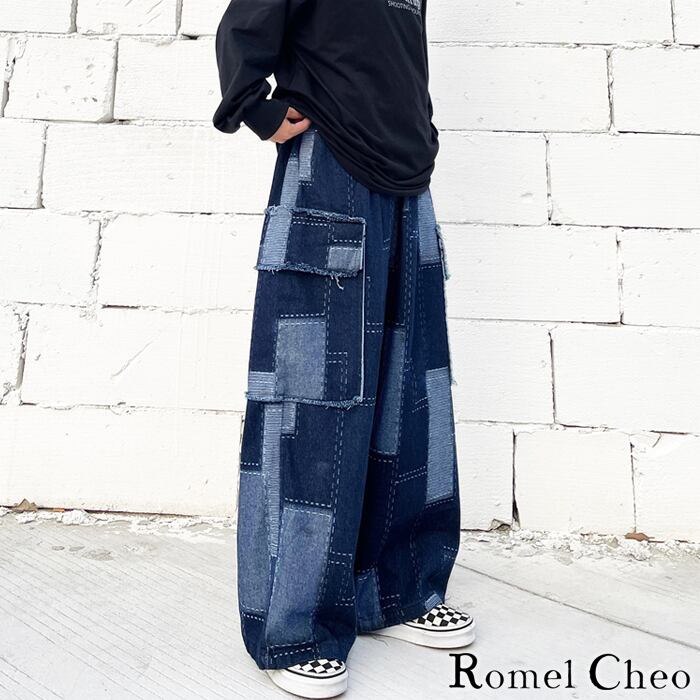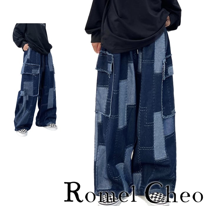 【お支払い確認後20日以内発送】RomelCheo リメイク風 パッチ 切替 デニム パンツ ワイド ジーンズ パッチワーク カーゴ ポケット ジーパン gパン 古着風 メンズ レディース 個性的 個性派 レトロ こなれ感 ウエストゴム 原宿系 ストリート系 スケーター カジュアル ファッション ロメルチェオ