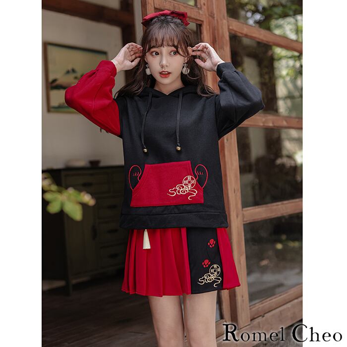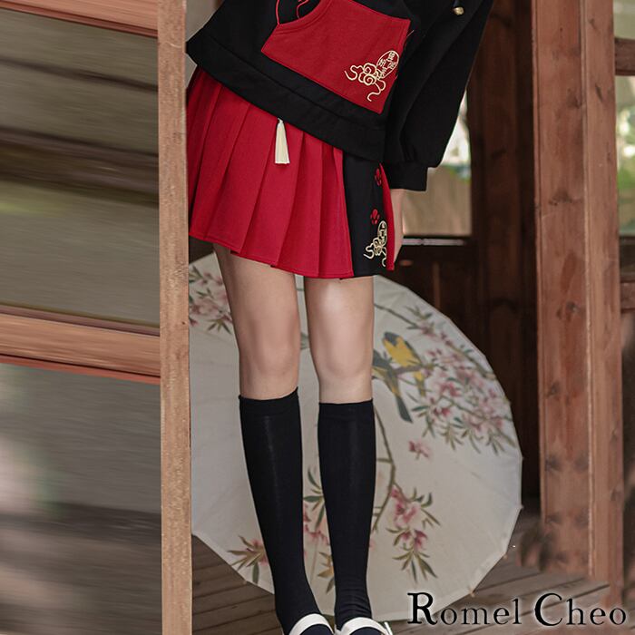 【お支払い確認後20日以内発送】RomelCheo 猫の 足跡 ミニ スカート プリーツ バイカラー 刺繍 和柄 和風 チャイナ風 赤黒 アジアン エスニック ロリータ 原宿系 青文字系 ガーリー 大人可愛い カジュアル ファッション 森ガール ロメルチェオ