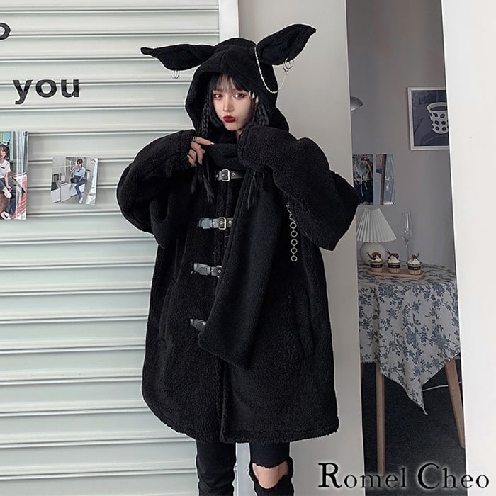 【お支払い確認後20日以内発送】RomelCheo 羊耳 フード マフラー 付き ボア ダッフル ジャケット ミドル丈 コート フリース もこもこ 帽子 襟巻き ひつじ アニマルフード チェーン 暖かい 中綿 冬 原宿系 地雷系 病みかわ ガーリー パンク ロック カジュアル ファッション ロメルチェオ