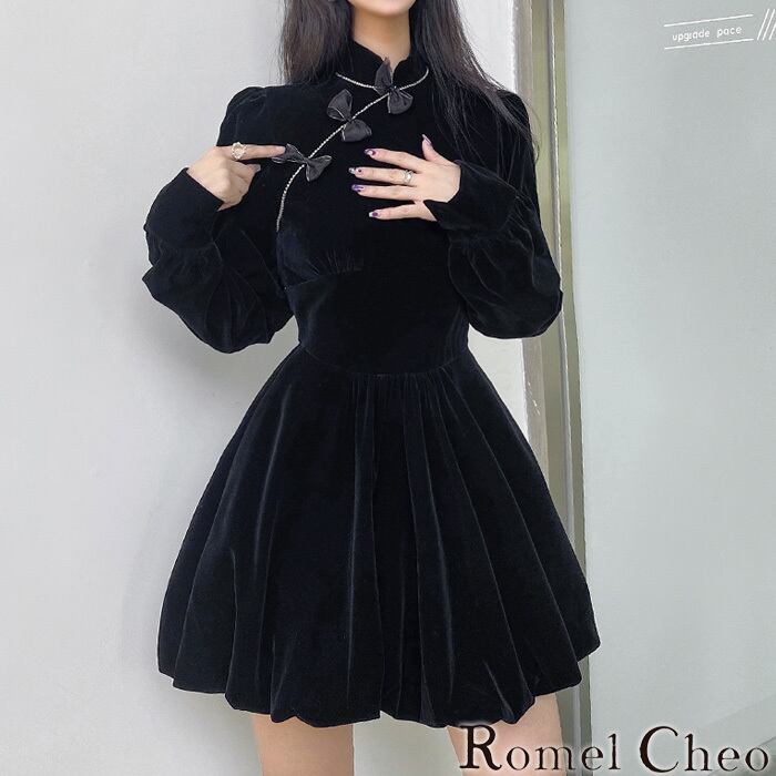 【お支払い確認後20日以内発送】RomelCheo ベロアリボンワンピース チャイナワンピ チャイナドレス ベロアワンピース ミニ丈ワンピ チャイナ服 チャイナボタン 長袖 Aライン ミニ丈 ボリューム袖 漢服 レディース モード系 ファッション 原宿系 青文字系 カジュアル ファッション ロメルチェオ