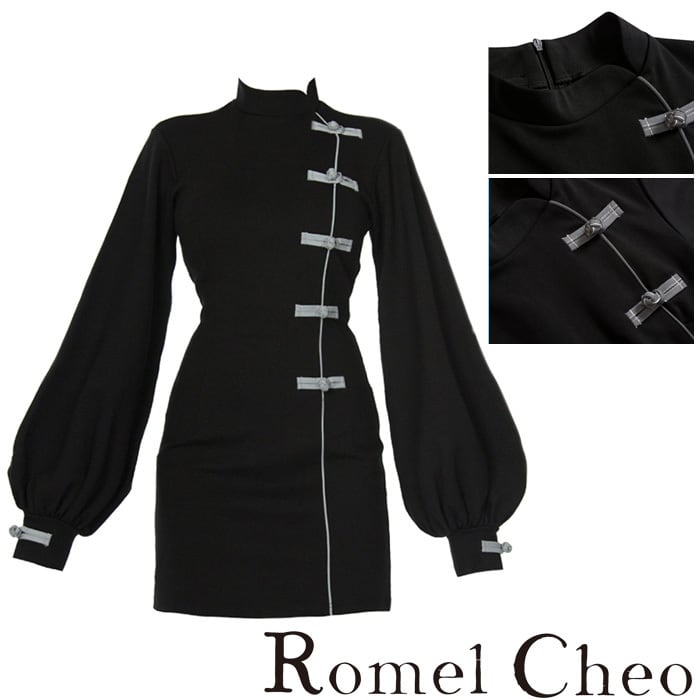 【お支払い確認後20日以内発送】RomelCheo パフスリーブチャイナミニワンピ チャイナワンピ チャイナドレス ミニ丈ワンピ チャイナ服 チャイナボタン 長袖 ランタンスリーブ ボリューム袖 漢服 レディース モード系 ファッション 原宿系 青文字系 カジュアル ファッション ロメルチェオ