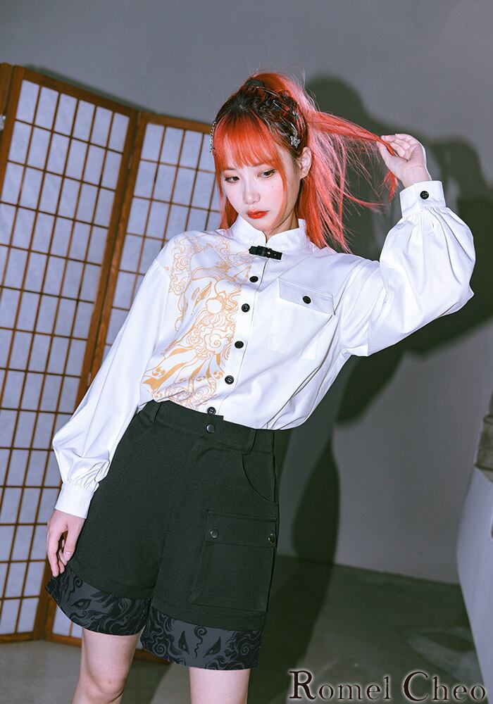 【お支払い確認後20日以内発送】RomelCheo 和柄ハーフパンツ ショートパンツ ショーパン 短パン 切り替え ビッグポケット カーゴパンツ ハーフカーゴ ハイウエスト モノトーン 個性的 和モード 和柄デザイン 和風 和レトロ カジュアル レディース モード系 ストリート 原宿系 青文字系