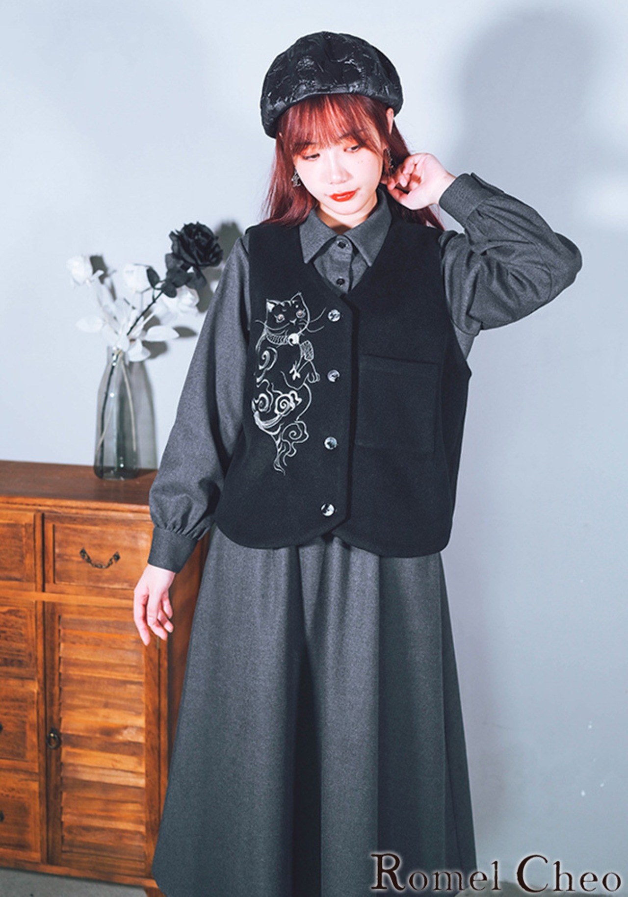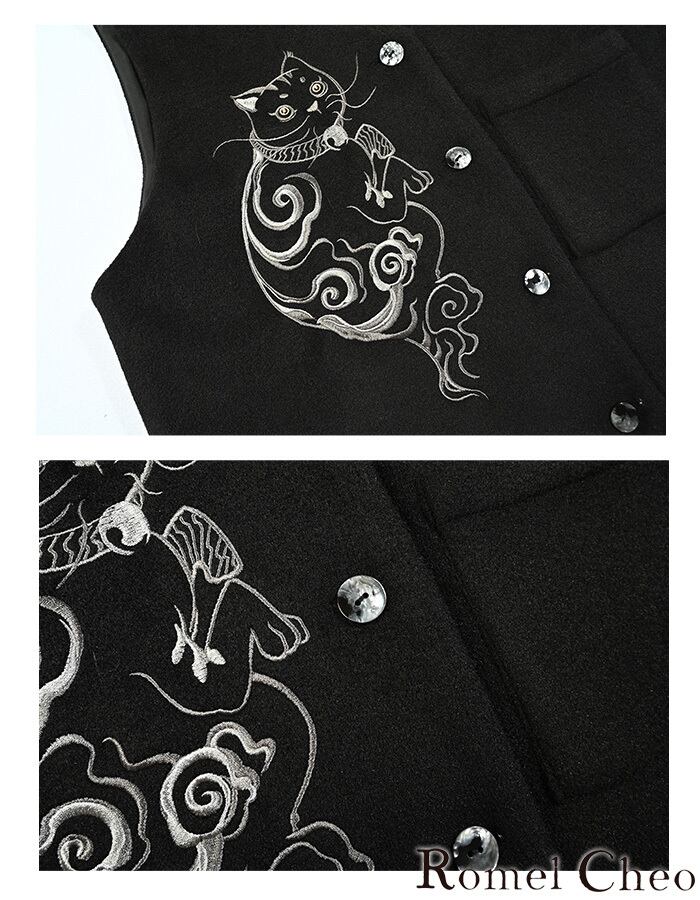 【お支払い確認後20日以内発送】RomelCheo 猫柄刺繍ベスト ビッグポケット ノースリーブ ジレ ジレベスト Vネックベスト Vネックカーディガン トップス チョッキ レイヤード 前開き 和柄 個性的 和風 カジュアル レディース モード系 ストリート 原宿系 青文字系