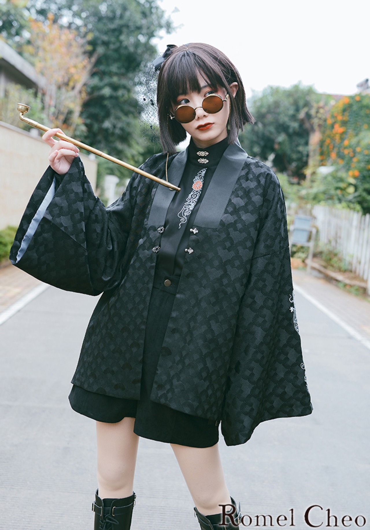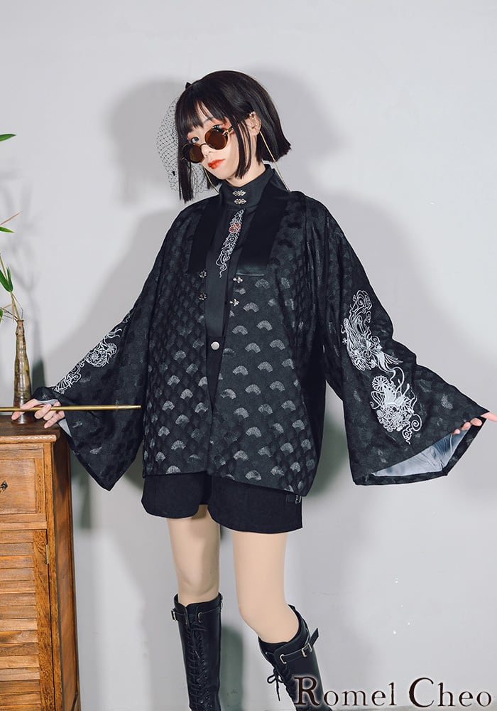 【お支払い確認後20日以内発送】RomelCheo 和風羽織りジャケット 和柄ポンチョ アウター ボリューム袖 オーバーサイズ 和柄カーディガン 和柄ジャケット 和式パーカー 和風ジャケット 個性的 和風 羽織 和モード 和ゴス カジュアル レディース モード系 ストリート 原宿系 青文字系