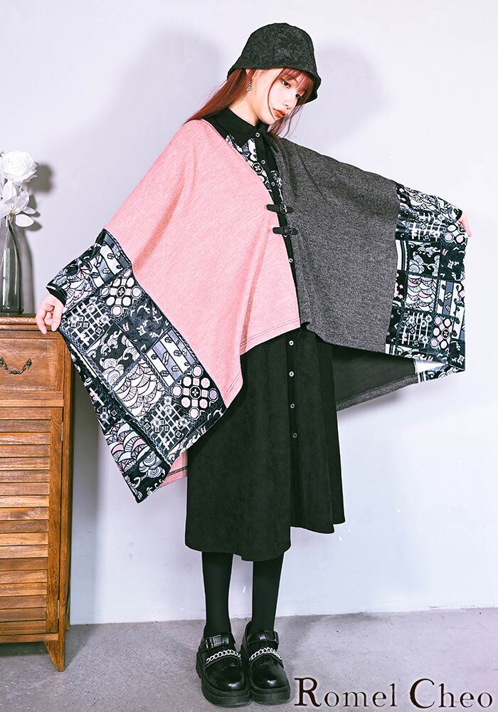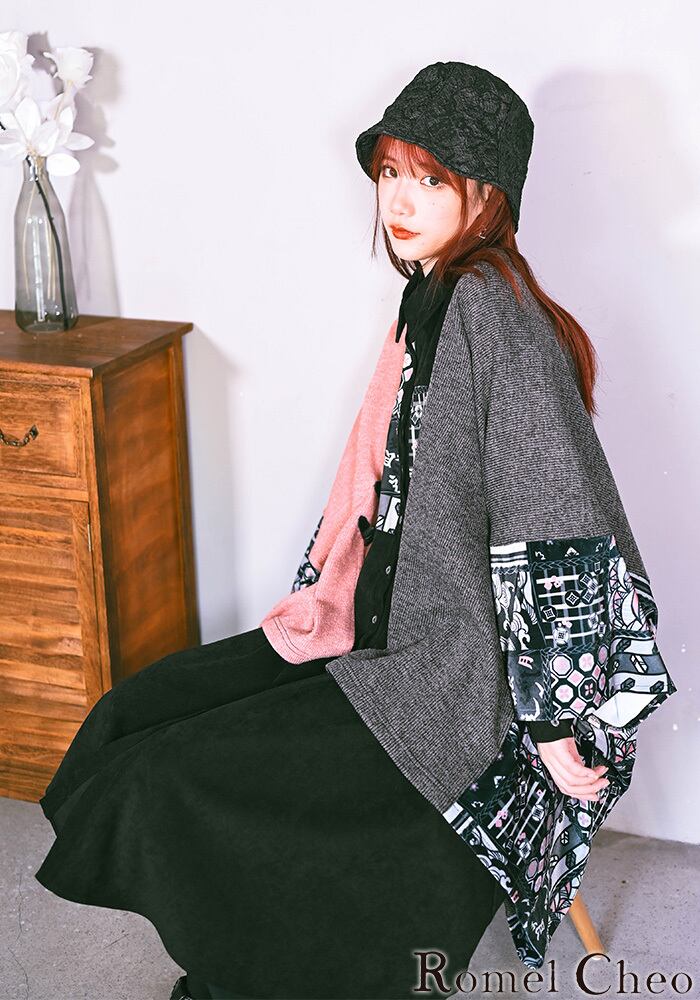 【お支払い確認後20日以内発送】RomelCheo アシメ和柄羽織カーディガン アシメカーデ ケープ マント カーディガン 変形カーディガン 和柄ポンチョ オーバーサイス ゆったり カーデ ボレロ 個性的 和風 羽織 和モード カジュアル レディース モード系 ストリート 原宿系 青文字系