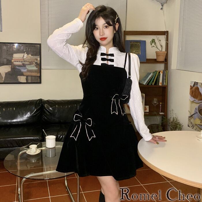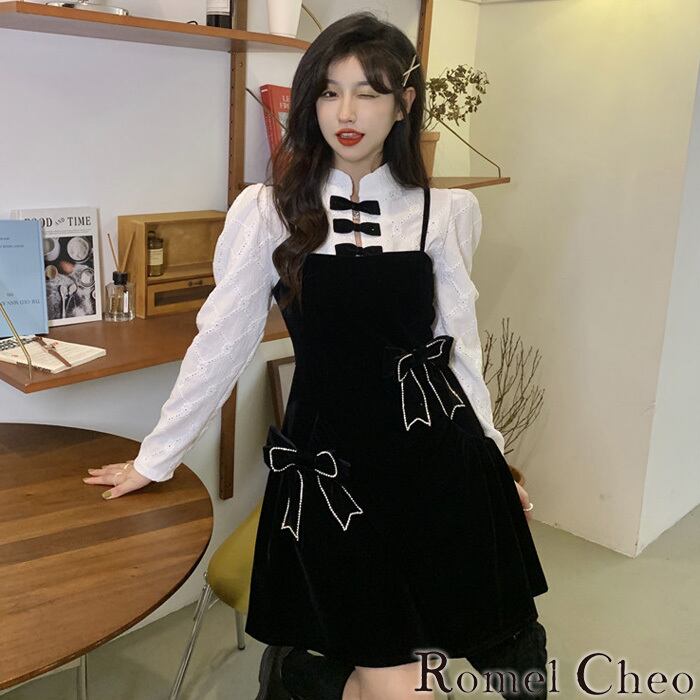 【お支払い確認後20日以内発送】RomelCheo チャイナシャツとストラップリボンワンピ チャイナワンピ チャイナドレス ミニ丈ワンピ シャツワンピ リボンワンピ フレア チャイナ服 チャイナボタン 長袖 レディース モード系 ファッション 原宿系 青文字系 カジュアル ファッション ロメルチェオ