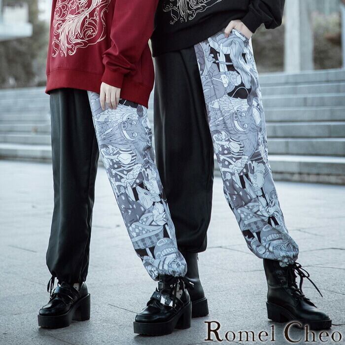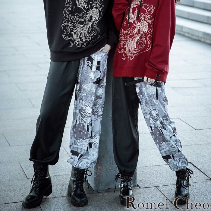 【お支払い確認後20日以内発送】RomelCheo レトロプリントイージーパンツ ジョガーパンツ トラックパンツ ストレートパンツ ゆったり アシメデザイン モノトーン 個性的 和風 和レトロ カジュアル メンズ レディース ユニセックス モード系 ストリート 原宿系 青文字系