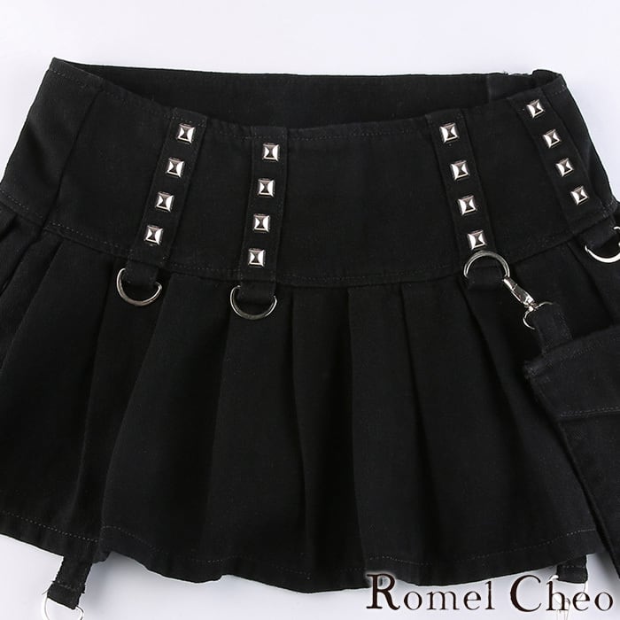 【送料無料】RomelCheo デニムプリーツ中空きパンツ リベットスカート ミニスカート ミニ丈 スプリットデザイン ツーピース レッグウォーマー パンク ロック カジュアル 個性的 病み系 ゴシック ロリータ カジュアル レディース モード系 ストリート 原宿系 青文字系