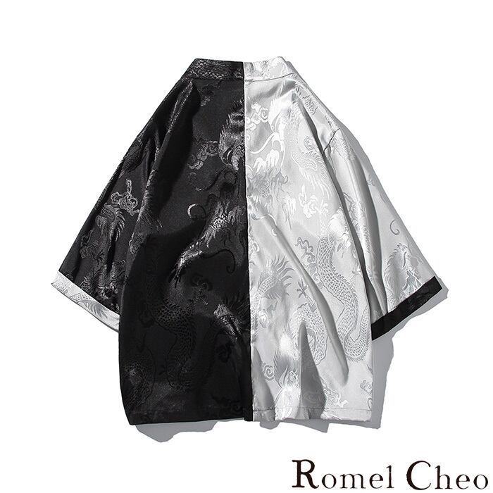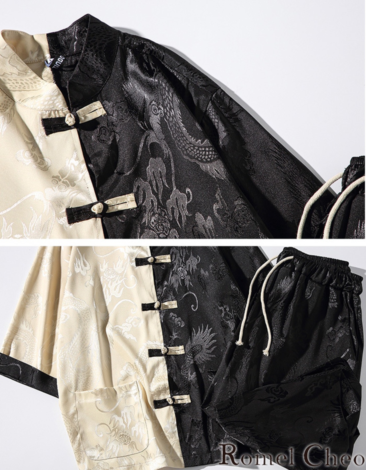 【お支払い確認後20日以内発送】RomelCheo アシメチャイナシャツセット 総柄シャツ チャイナ服 チャイナシャツ アシメシャツ チャイナボタン ハーフパンツ セットアップ 上下セット エスニック 漢服 中華服 カジュアル メンズ レディース ユニセックス モード系 ストリート 原宿系 青文字系