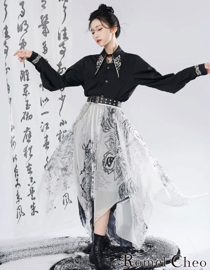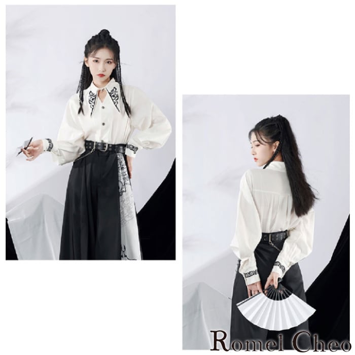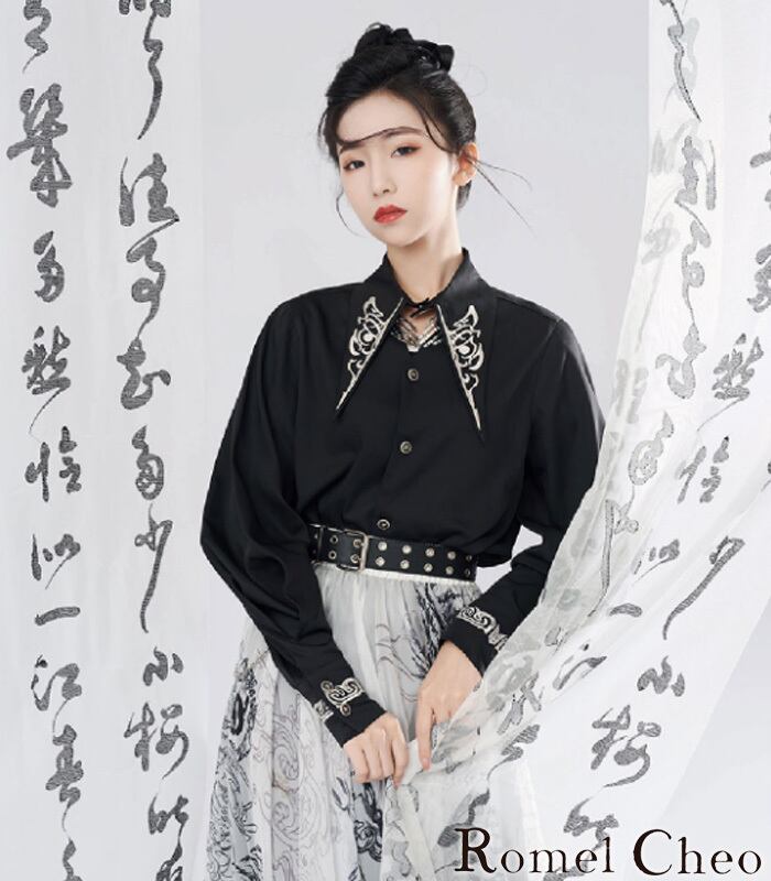 【お支払い確認後20日以内発送】RomelCheo 胸開きモノクロシャツ シャツ 長袖 ロングカフスシャツ ボリューム袖 バルーンスリーブ ポイントカラーシャツ 変形襟 レトロモダン モノトーン シンプル カジュアル メンズ レディース ユニセックス 個性的 モード系 ストリート 原宿系 青文字系