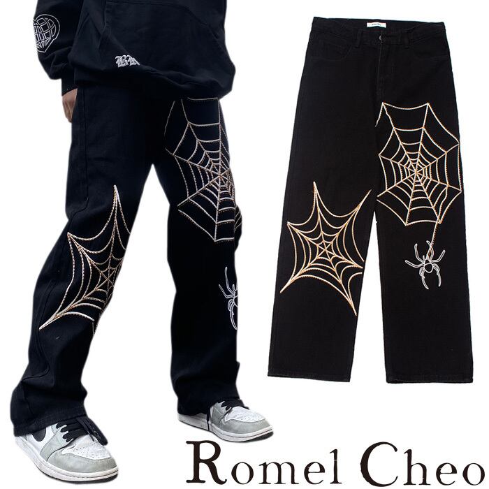 【お支払い確認後20日以内発送】RomelCheo スパイダーウェブデニムパンツ デニムパンツ ワイドパンツ ワイドレッグパンツ 太目 ゆったり ロングパンツ ストレートパンツ オーバーサイズ ジーンズ バギーパン ダボパン ロック HIPHOP カジュアル メンズ モード系 ストリート 原宿系 青文字系