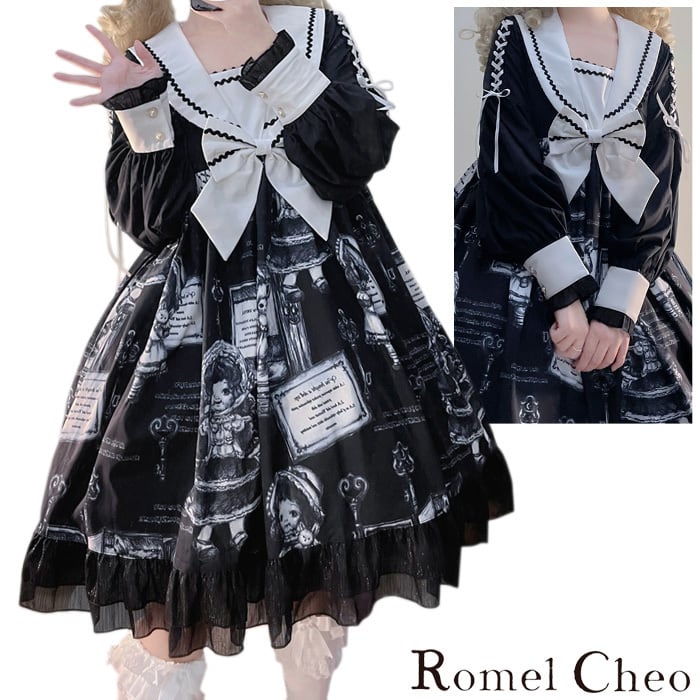 【お支払い確認後20日以内発送】RomelCheo モノクロアンティークドールワンピース セーラーワンピ フリルワンピ 長袖 ひざ丈 Aライン ミディ丈 リボン ロリータ ゴスロリ ゆめかわいい 病みかわ 黒ロリ レディース モード系 ファッション 原宿系 青文字系 カジュアル ファッション ロメルチェオ