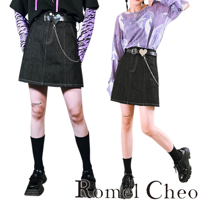 【お支払い確認後20日以内発送】RomelCheo デニムミニスカート デニムスカート ハイウエストスカート ミニ丈 ショート丈 膝上丈 Aライン フレアスカート スカート ボトムス カジュアル レディース モード系 ストリート 原宿系 青文字系 ファッション ロメルチェオ
