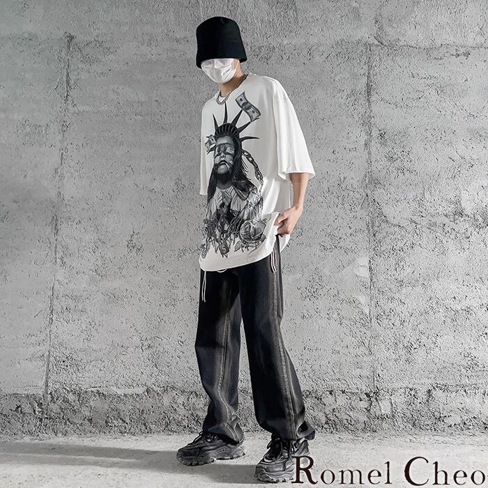 【お支払い確認後20日以内発送】RomelCheo 拘束女神プリントTシャツ グラフィックTシャツ 半袖 TEE オーバーサイズ ダボT ゆったり ルーズシルエット バックプリント カジュアル 白 黒 トップス 個性的 HIPHOP メンズ モード系 ストリート 原宿系 青文字系 ファッション ロメルチェオ