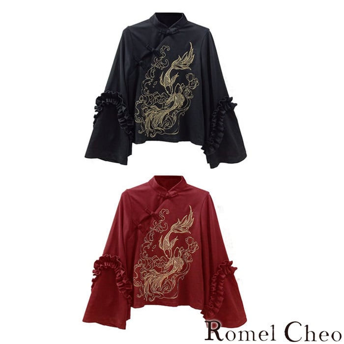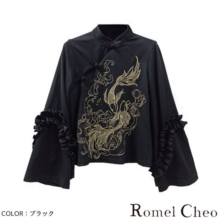 【お支払い確認後20日以内発送】RomelCheo 鯉柄フリルチャイナシャツ フリルシャツ チャイナ服 チャイナボタン フレアスリーブ シャツ アジアン チャイナ風 エスニック 民族風 レディース ストリート モード系 ファッション 原宿系 青文字系 カジュアル ファッション ロメルチェオ