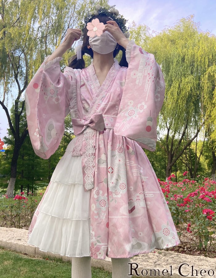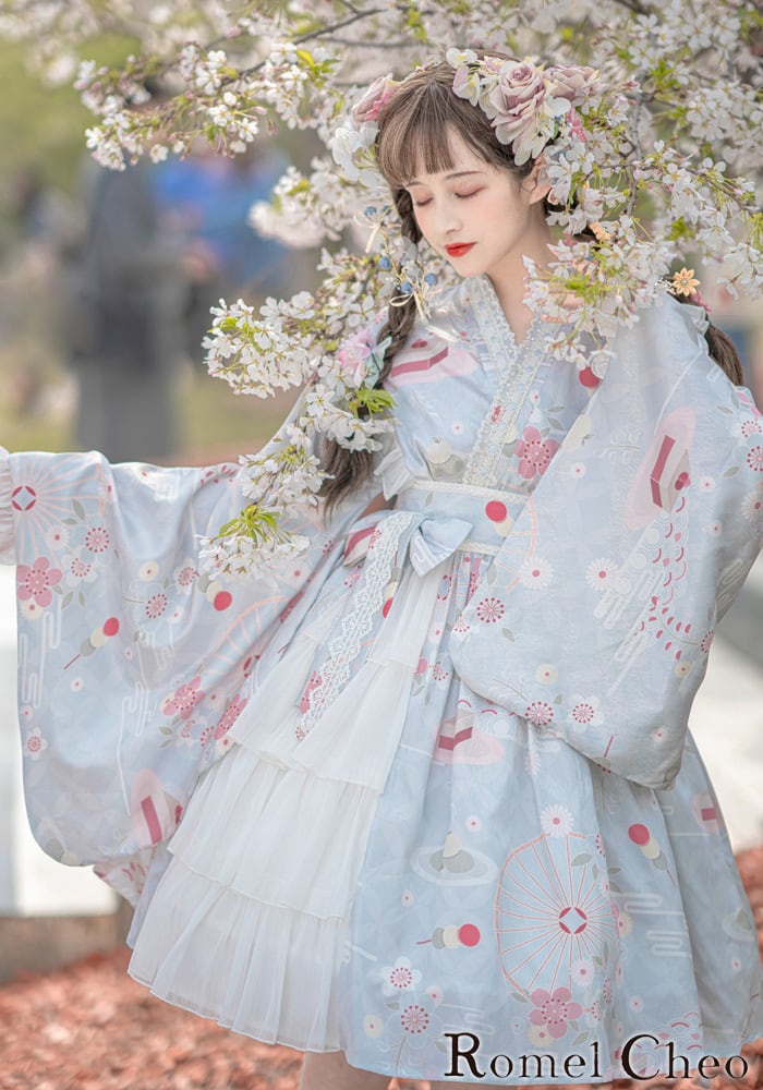 【お支払い確認後20日以内発送】RomelCheo 和風ゴスロリゆめかわワンピース ロリータワンピ フリルワンピ ひざ丈 リボン ハイウエスト ウエストマーク 着物スリーブ ロリータ 甘ロリ 病みかわ 華ロリ レディース モード系 ファッション 原宿系 青文字系 カジュアル ファッション ロメルチェオ